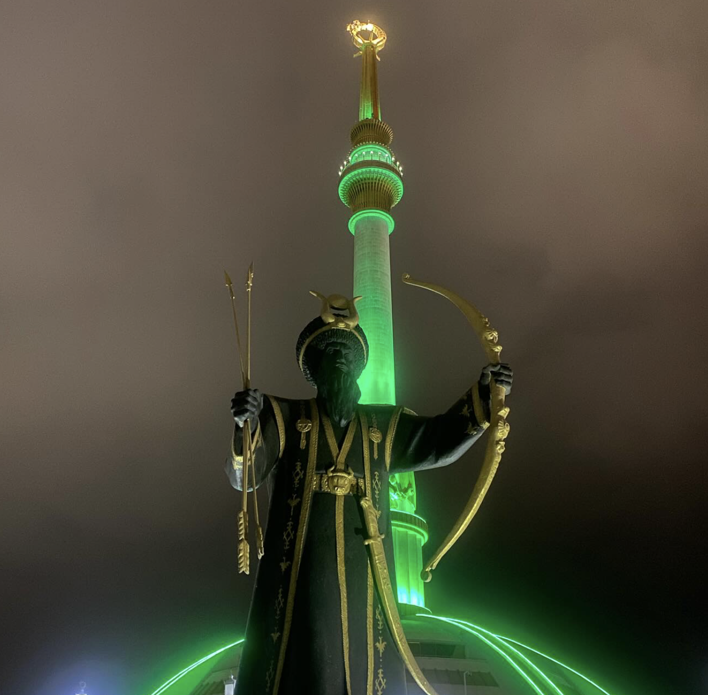 "Oh my goodness gracious. None of this can properly be captured on a phone, but it was like Vegas meets the capital in Hunger Games meets a fever dream. First we went to a mall to take in local life and have a quick dinner and the mall was cool AF actually. One of the best supermarkets I’ve ever been to in this part of the world (especially shocking considering how abysmal the shops were outside the city), fashionable club cafes, cool kids, etc Standard mall but with a Turkmenistan twist. First stop on the night tour was Independence Park. The park takes up half the city’s green space and the center piece is of course a golden statue of Niyazov. It’s all very in your face impressive in a wtf way. Which reminds me, Michael told us women aren’t allowed to drive until after 40!? apparently it is an informal law banning women drivers because they are blamed for all traffic accidents?! Anyway, next was the Olympic village and the world’s largest horse statue followed by the Palace of Happiness (wedding palace) that is a freaking giant disco ball. We also stopped at the Ruhnama Monument (I am desperate for an English language copy of this) and yeah that was our time in Ashgabat. I am speechless."