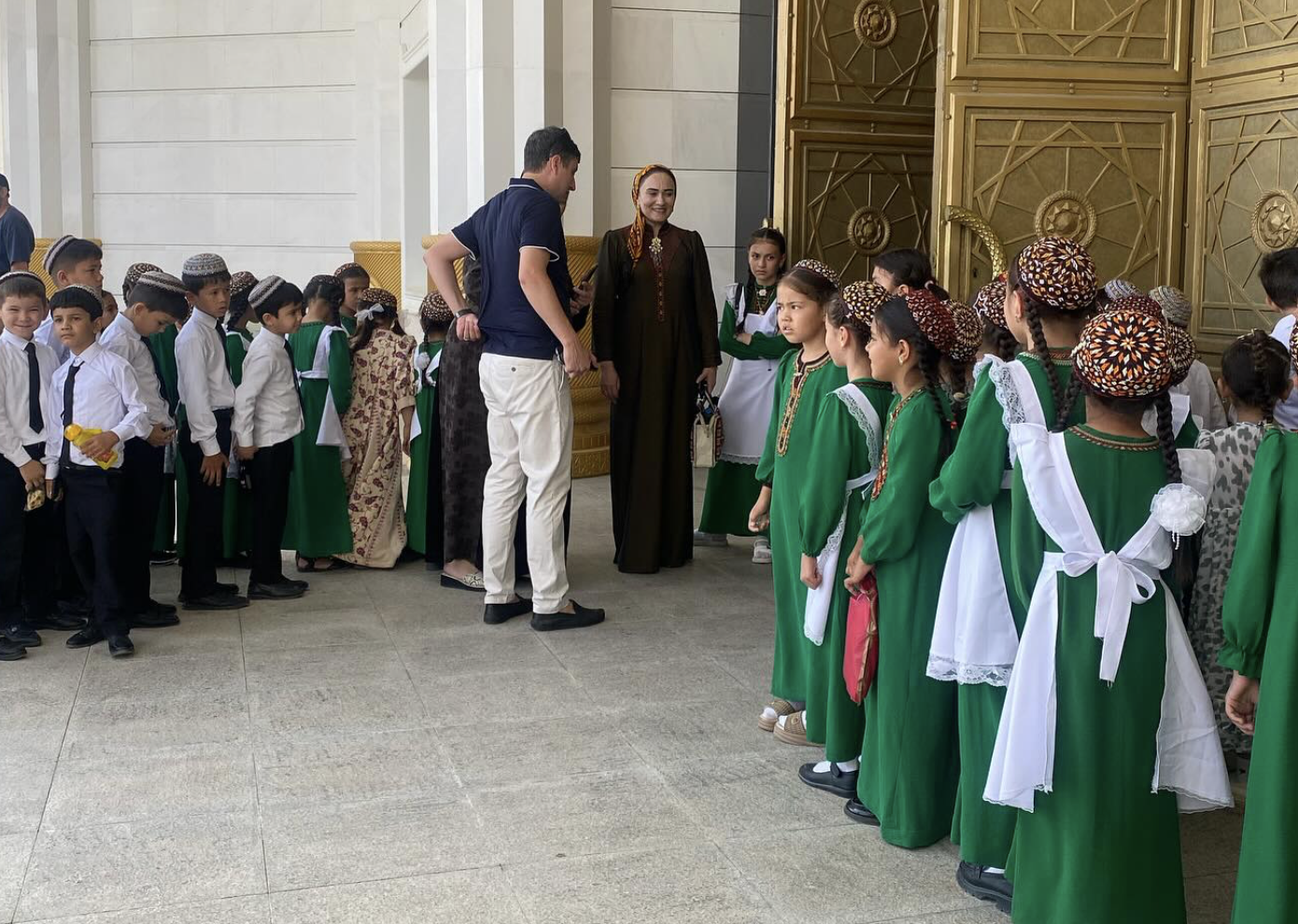 "Daytime city tour took us first to the National Memorial complex built to honor those who perished during WWII and the 1948 Ashgabat earthquake that destroyed the city and killed 10% of the population. The complex is monumental. Next was the National Museum which was also hosting school kids in the most beautiful uniforms of traditional dress. They were eerily well behaved. The museum was very interesting historically speaking, we learned of the ancient civilizations and cities that thrived here and were a major part of the Silk Road. We then visited the world’s largest indoor ferris wheel (Turkmenistan holds many a crazy Guinness world record) and it is ridiculous but oh was it fun. We were the only ones there and there were transformers outside for some inexplicable reason. On to the Turkmenbashi Mosque and Mausoleum. Nobody was surprised at the scale of this place. Nearby was his hometown so we also visited a gold statue of him there. There are several. Lunch time at the Russian bazaar concluded the tour. Michael had me try a few local specialties - some new to me, some not so new. You have your fermented, carbonated camel’s milk of course and dried balls of cheese (kurut) both standard central Asian fare, the twist here being they use camel’s milk being a desert country. I also tried a local dish called Dograma which is a sort of soupy stew made with pieces of bread, meat and onions. I worried I would have a beshbarmak situation on my hands (the worst thing I’ve ever eaten in my life), but alas it was absolutely delicious and comforting. Winner. Next taste was also delicious and new to me - sun dried melon. Who knew! Has even chocolatey notes. Speaking of chocolate notes, the local Turkmen cognac tastes of chocolate and cream even though it contains neither. It is delicious. Lastly I sampled 3 different caviars, extremely high quality. I was very surprised I enjoyed it. I’ve had violently bad experiences trying caviar in central Asian markets before! We thought we had seen plenty of weird up to this point, but we had yet to see the city at night!"